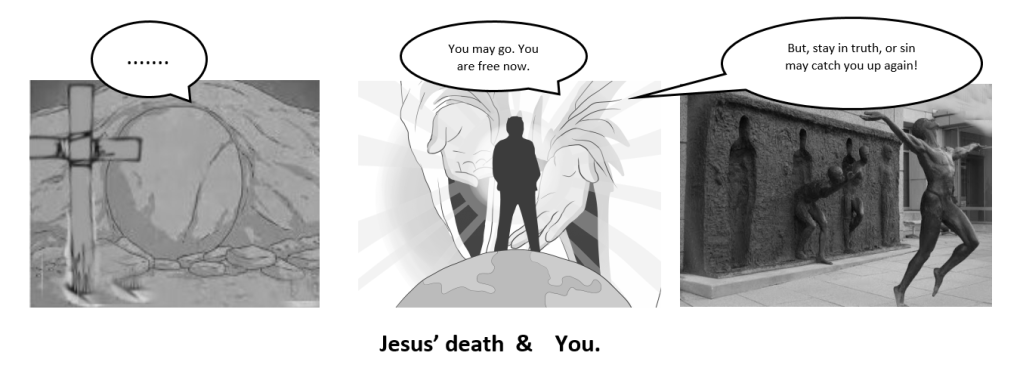 아버지 하나님의 사랑과 아들 예수님의 헌신으로, 수천년동안 인류가 풀어 보려고 안달했던 문제가 풀렸습니다. 애굽에 잡혀 강제로 노예생활을 하던 이스라엘 사람들이 양의 피로 살아남아 유월절 날이 밝자 걸어 나갈수 있었던것 처럼, 죄에 얽매여 있던 인류는 예수님이 죽으시는 순간 그의 피로 죄의 굴레 (생노병사의 굴레) 에서 영생으로 걸어 나갈수 있게 되었습니다.